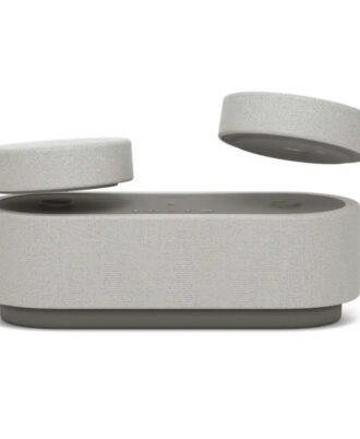 Altavoces traseros inalámbricos con montaje en pared para tu barra de sonido, con altavoz orientado hacia arriba, tweeter, woofer, radiadores pasivos duales y una batería integrada.
