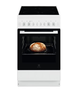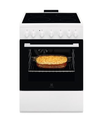 Cocina vitrocerámica Electrolux de 600 mm de la Serie 400, de 85 x 60 x 60 cm, placa vitrocerámica de 4 zonas, Horno multifunción con ventilador, con limpieza catalítica, grill, 5 funciones, cajón inferior para guardar utensilios de cocina, color blanco.