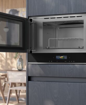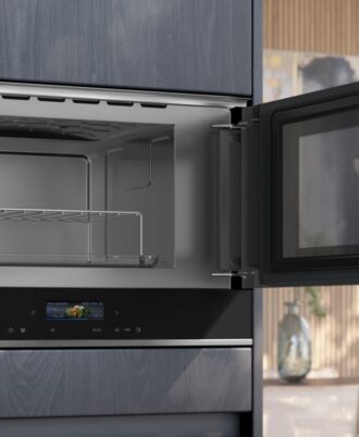 Horno Siemens con microondas inteligente con asistente por control de voz para un control intuitivo. Capacidad: 45 litros. softMove: apertura y cierre amortiguado de puerta, Apertura abatible.