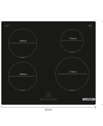 Placa de induccion Bosch de 60 cm de ancho y 4 zonas. Programación de tiempo de cocción. Función Boost: hierve agua hasta un 50% más rapido. Función Memoria: en caso de apagado accidental, se vuelven a restablecer los ajustes al encender la placa dentro de los 4 segundos siguientes.