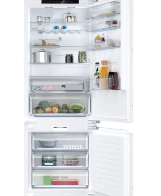 Frigorífico combi Bosch integrable. Tecnología No Frost en el congelador. Iluminación interior LED. Cajón VitaFresh con regulador de humedad para frutas y verduras. Clase de eficiencia energética: D. Se conecta a tu móvil vía Home Connect. Iluminación interior LED, y además, con efecto SoftStart. Iluminación en el congelador.