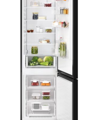 Frigorífico Combi Serie 8000 Cooling 360° de 202 cm x 60 cm, Twintech No Frost con Metal Multiflow, display digital LED en el interior, cajón ExtraChill, luces LED, tirador integrado, puerta plana Cristal Negro Mate.