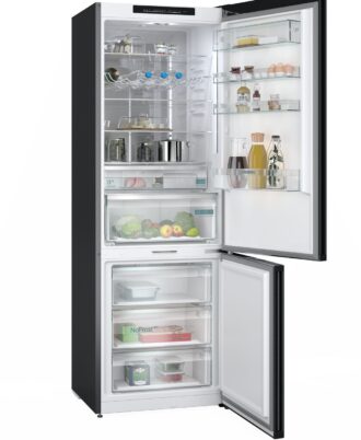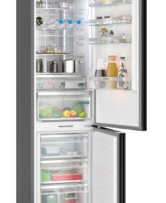 Frigorífico combinado Siemens noFrost. Diseño en cristal negro satinado, 203 x 60 cm. Clase B. cajones 0°C. Tecnologia inverter. Panel trasero interior con diseño metalizado y MultiAirFlow. Se conecta a tu móvil vía Home Connect