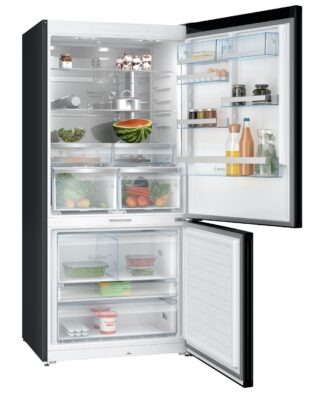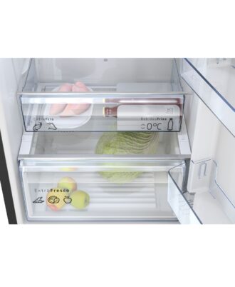 Frigorífico combi Bosch XXL. Puertas Acero negro antihuellas, 186 x 86 cm. Clase B. VitaFresh Pro 0ºC. Total No Frost. Multi Airflow. Tecnología VitaFresh Plus. 3 cajones en el congelador. Tiradores laterales integrados. Iluminación interior LED. Puerta reversible. Home Connect, Control remoto.