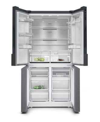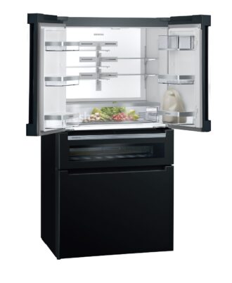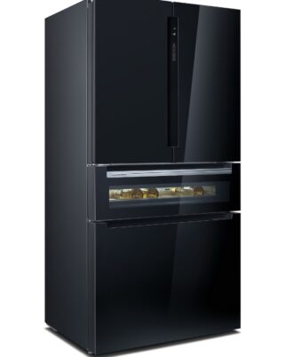 Frigorífico French Door Siemens KF96RSBEA de libre instalación. Puertas Cristal Negro, 183 x 90,6 cm. Clase E Cajón 0ºC, Sistema multiAirflow. Display touchControl digital integrado en la puerta. Home Connect: controla tu frigorífico inteligente estés donde estés. Compartimento especial para bebidas con ajustes de temperatura predefinidos, y opción de ajustes individuales a través de la app Home Connect.