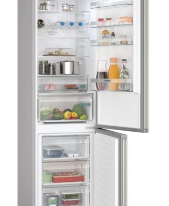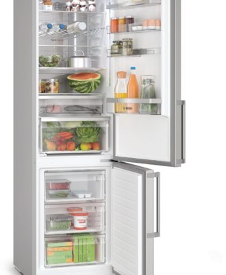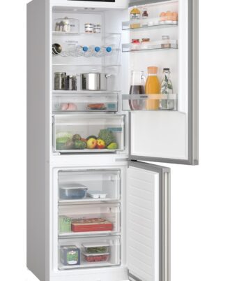 Frigorífico combinado Siemens noFrost. Acero antihuellas, 203 x 60 cm. Clase B. cajones 0°C. Panel trasero interior con diseño metalizado y MultiAirFlow. Iluminación interior mediante LED. Regulación independiente de temperatura en el frigorífico y congelador. Tirador exterior.