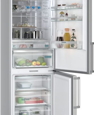 Frigorífico combinado Siemens noFrost. Acero antihuellas, 203 x 60 cm. Clase A. cajones 0°C. Iluminación interior mediante LED. Regulación independiente de temperatura en el frigorífico y congelador. Tiradores laterales integrados.