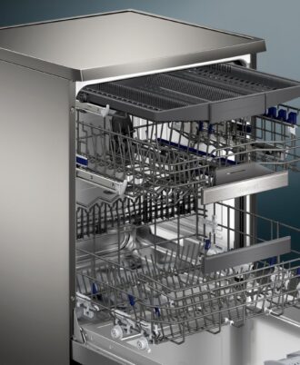 Lavavajillas Siemens de Libre instalación, 60 cm, 14 servicios, Acero inoxidable, Zeolitas, display TFT con touchControl oculto, 3ª bandeja. Apertura automática autoOpen Dry. 9,5 litros, luz interior emotionLight. Cesta superior rackMatic regulable en 3 alturas.