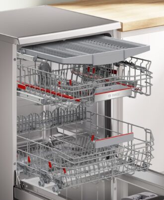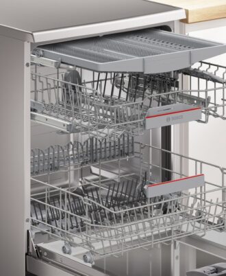 Lavavajillas Bosch Acero antihuellas. Clase A. Controlalo desde la app de Home Connect y mejora los resultados de secado. 3ª bandeja VarioDrawer. Zona ExtraClean. Consumo de agua por ciclo 9 litros. Nivel de ruido 42 dB.