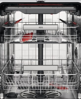 Lavavajillas integrable de 45 cm AEG Serie 7000 GlassCare para 10 cubiertos con QuickSelect y 7 programas a 4 temperaturas, 3ª bandeja MaxiFlex, Brazo aspersor satélite dúal + Waterfall, Motor Inverter, SoftGrips y SoftSpikes, Puerta deslizante, Nivel de ruido 44 dB(A), 10 cubiertos, Beam on Floor.