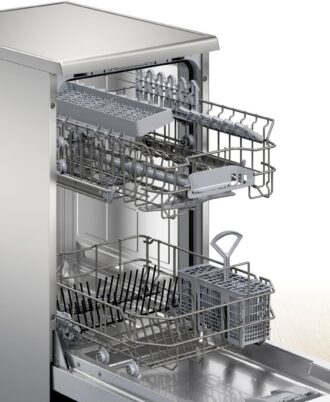 Lavavajillas de libre instalación Bosch, 45 cm, Acero. Clase E. Motor EcoSilence. electrodoméstico con conectividad inteligente. Consumo de agua por ciclo: 8.9 litros. Capacidad: 10 servicios. Cuba interior del lavavajillas de acero inoxidable. 10 años de garantía en la cuba