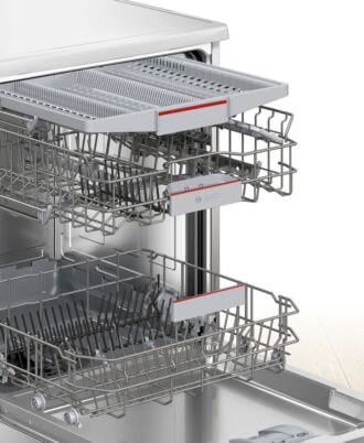 Lavavajillas Bosch. Clase E. 3ª bandeja VarioDrawer. Motor EcoSilence. 13 servicios. Cesta superior RackMatic regulable en 3 alturas. Información de tiempo restante, reposición de sal y abrillantador. 6 programas de lavado: Intensivo 70 °C, Automático 45-65 °C, ECO 50 °C, Copas 40 °C, 1 hora 65 °C y prelavado
