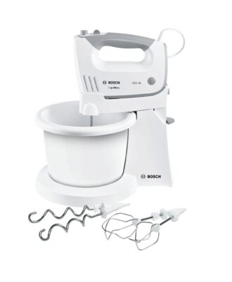 Batidora de respostería Bosch, ErgoMixx standn’bowl, 450 W, Blanco. Silenciosa, pero potente: cinco niveles de velocidad diferentes.