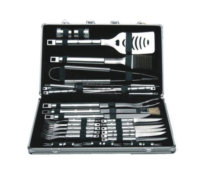 | Compuesta por 6 tenedores, 6 cuchillos, 6 brochetas, 6 pinchos maíz, salero, pimentero, espátula, tenedor de trinchar,cuchillo grande barbacoa, pinzas, brocha y raspador grill. |