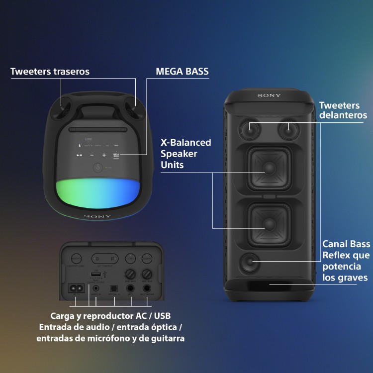 - Sonido de fiesta omnidireccional con X-Balanced Speaker Unit y cinco tweeters frontales y traseros.