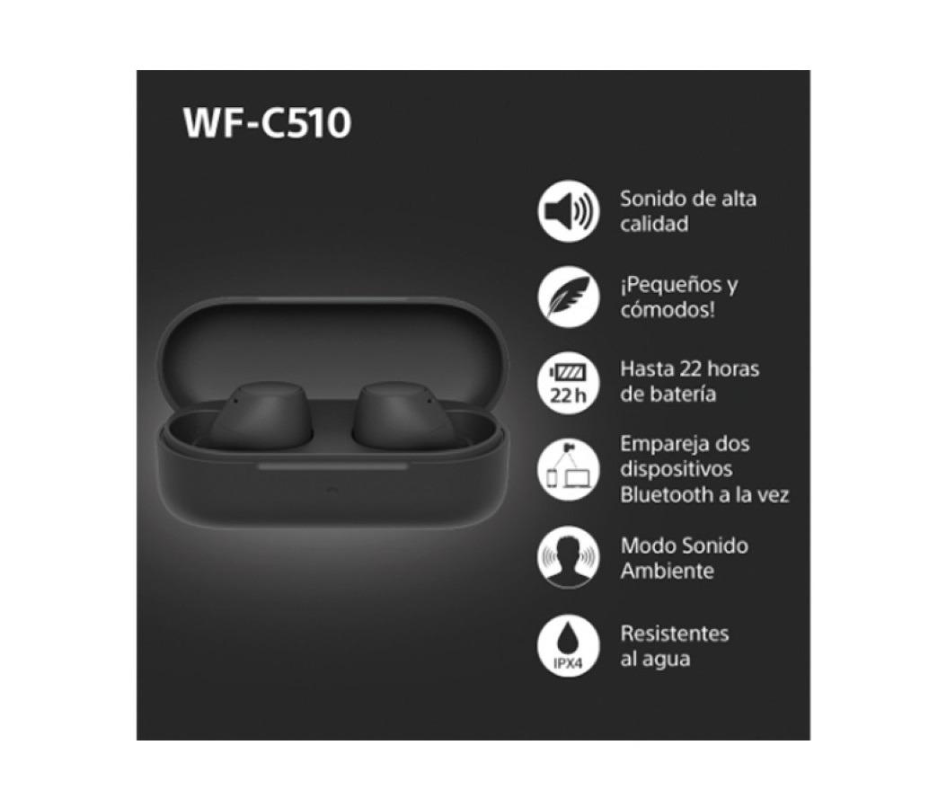 Los botones de los auriculares WF-C510 no solo te permiten reproducir, detener o saltar canciones y ajustar el volumen, sino también acceder al asistente de voz de tu smartphone y recibir llamadas con manos libres de forma sencilla.