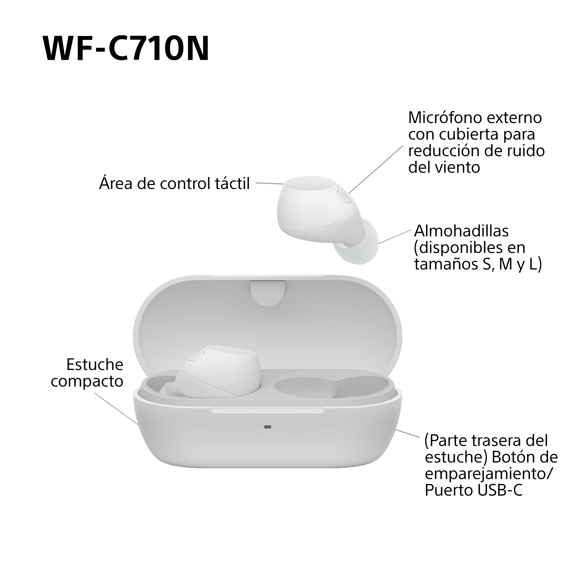Los auriculares WF-C710N tienen toda la funcionalidad que necesitas, incluidos micrófonos adicionales para un mejor Noise Cancelling. Al mismo tiempo, son compactos, fáciles de llevar y cómodos de usar. Su forma redondeada y sin bordes los hace cómodos para orejas de todos los tamaños.