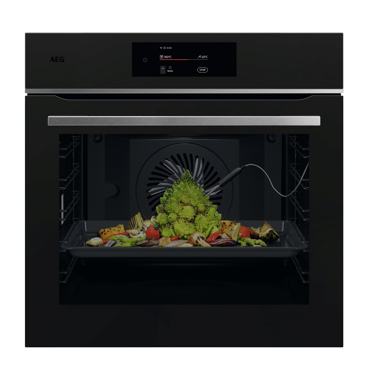 Horno pirolítico multifunción AEG TE8PB731AT de la Serie 7000 MealAssist y Display CookSmart Touch 4,3 » con WiFi, de 71 litros, 16 funciones y 91 programas automáticos, sonda térmica, carriles telescópicos en 1 nível, apertura y cierre suave de la puerta de 4 cristales, cristal negro mate con perfil Inox Infinity y tirador negro anodizado.