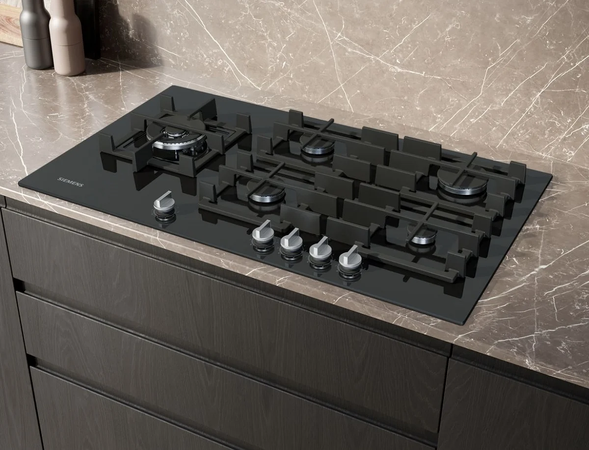 Placa de gas de cristal templado Siemens ER9A6SH40 con tecnología stepFlame para un control preciso de la llama, conexión inteligente placa-campana, mandos extraíbles y parrillas semi continuas para una fácil limpieza.
