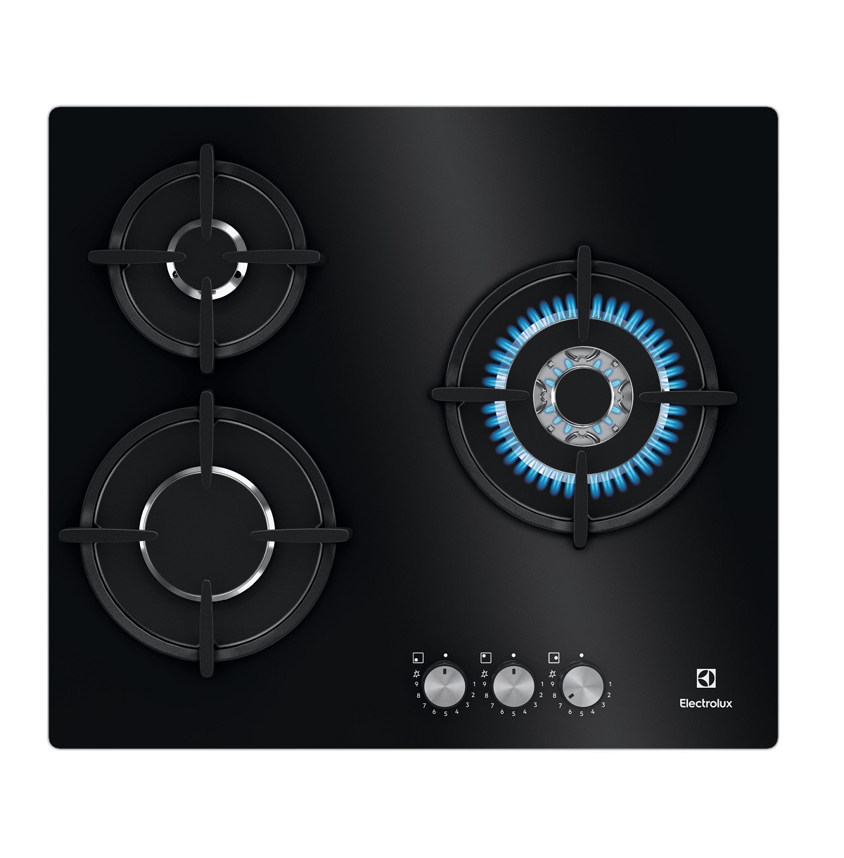 Placa Gas Electrolux on Glass de 60 cm y 3 Quemadores SpeedBurner + Zona Wok, Mandos frontales StepPower con encendido electrónico integrado y termopar de seguridad automático, Inyectores para intercambio de tipo de suministro incluidos, parrillas de hierro fundido.