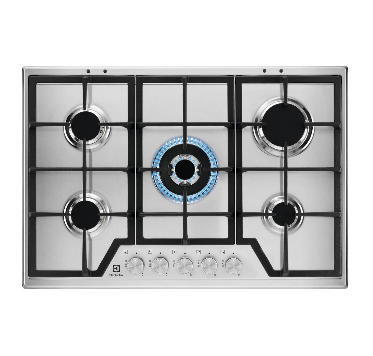 Placa de Gas KGS7536SX de 75 cm y 8 mm de espesor con 5 Quemadores SpeedBurner + Zona Wok, encendido electrónico integrado con termopar de seguridad automático, Inyectores para intercambio de tipo de suministro incluidos, parrillas de hierro fundido.