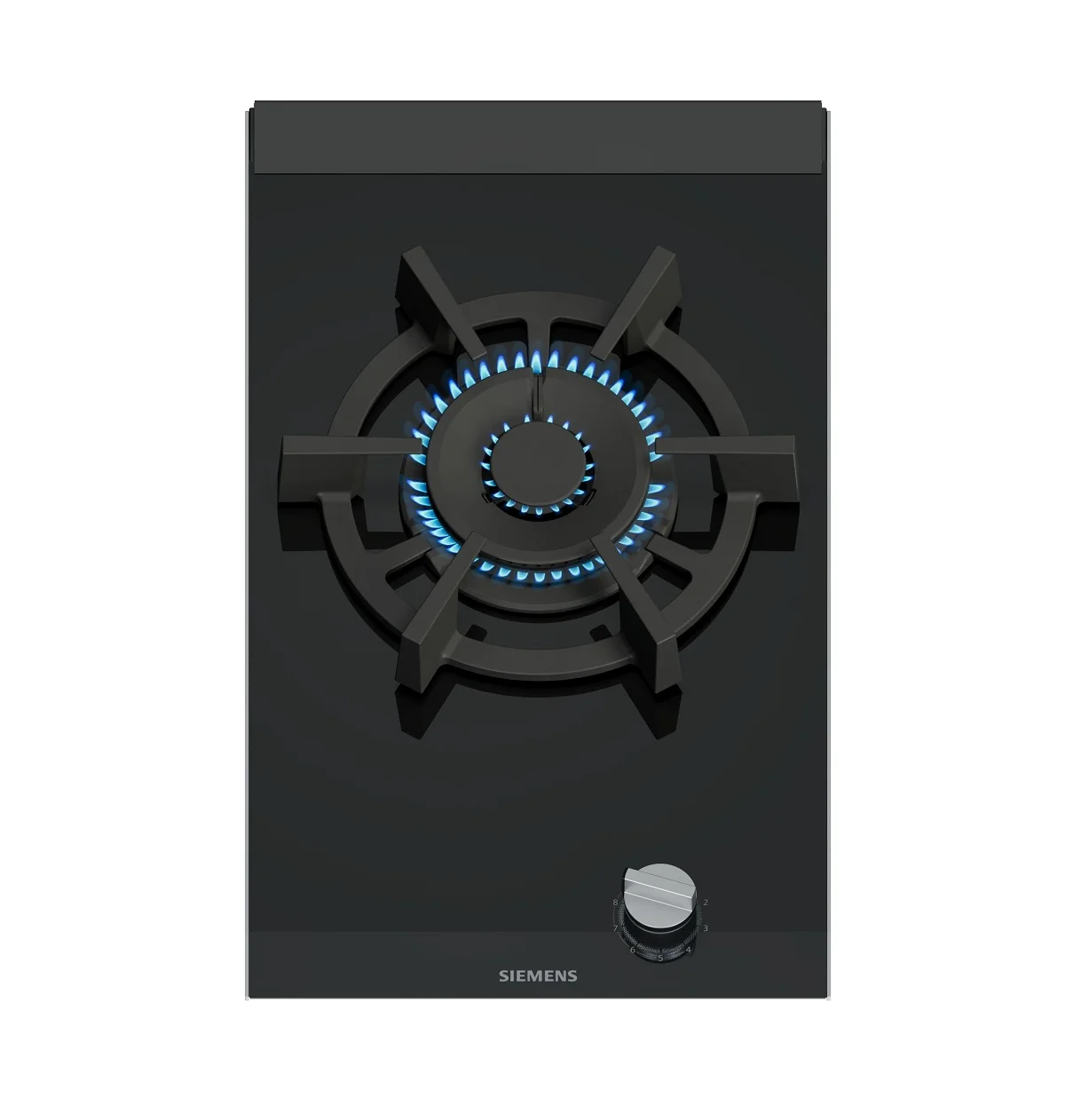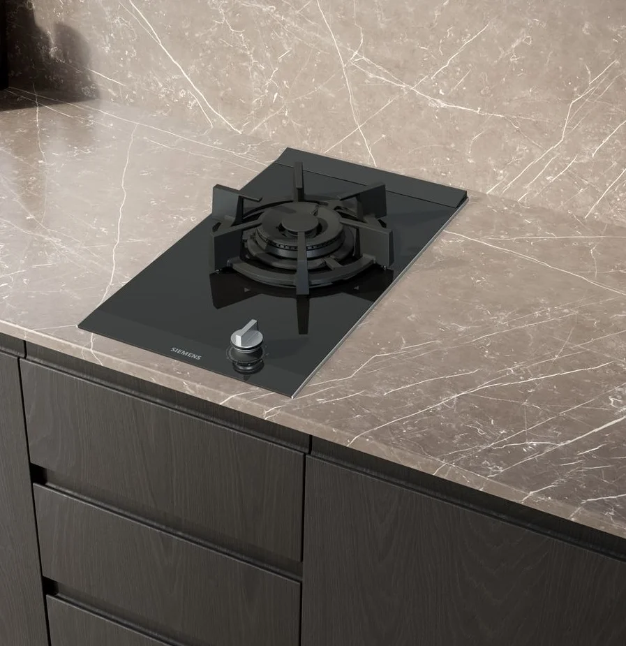 Placa de gas Siemens ER3A6AI10 Cristal negro. 30 cm de ancho. 1 quemador de gas. Encendido eléctrico integrado en el mando. Seguridad gasStop. Preparada para gas natural (20mbar). Inyectores de gas butano incluidos.