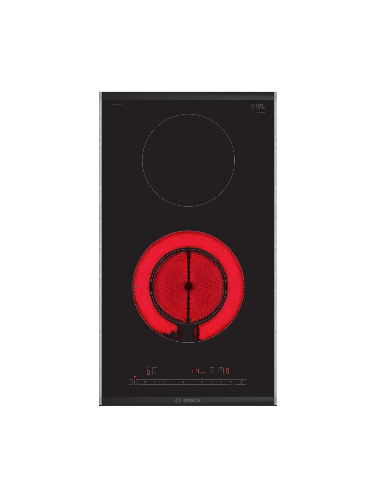 Dominó vitrocerámica PKF375FP2E de 30 cm de ancho. Control Control DirectSelect con 17 niveles de cocción. Función Memoria. Programación de tiempo de cocción para cada zona y avisador acústico. Bloqueo de seguridad para niños automático o manual. Desconexión automática de seguridad de la placa