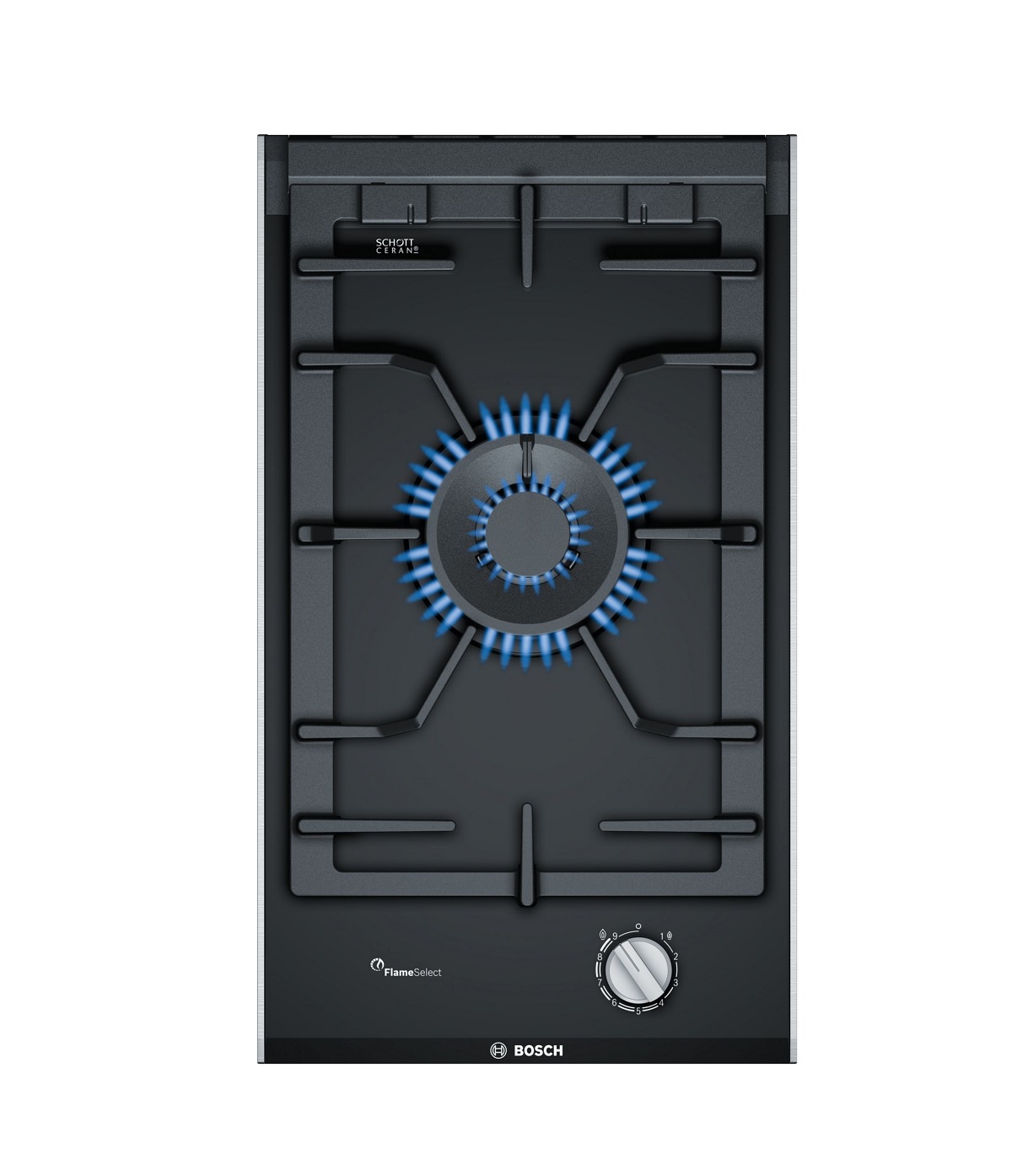 Placa de gas Bosch de 30 cm de ancho. Teminación Premium. regulación precisa de la llama con 9 niveles de potencia. Cristal vitrocerámico negro. 1 quemador Wok con regulación dual de la llama. Compatible con biometano.