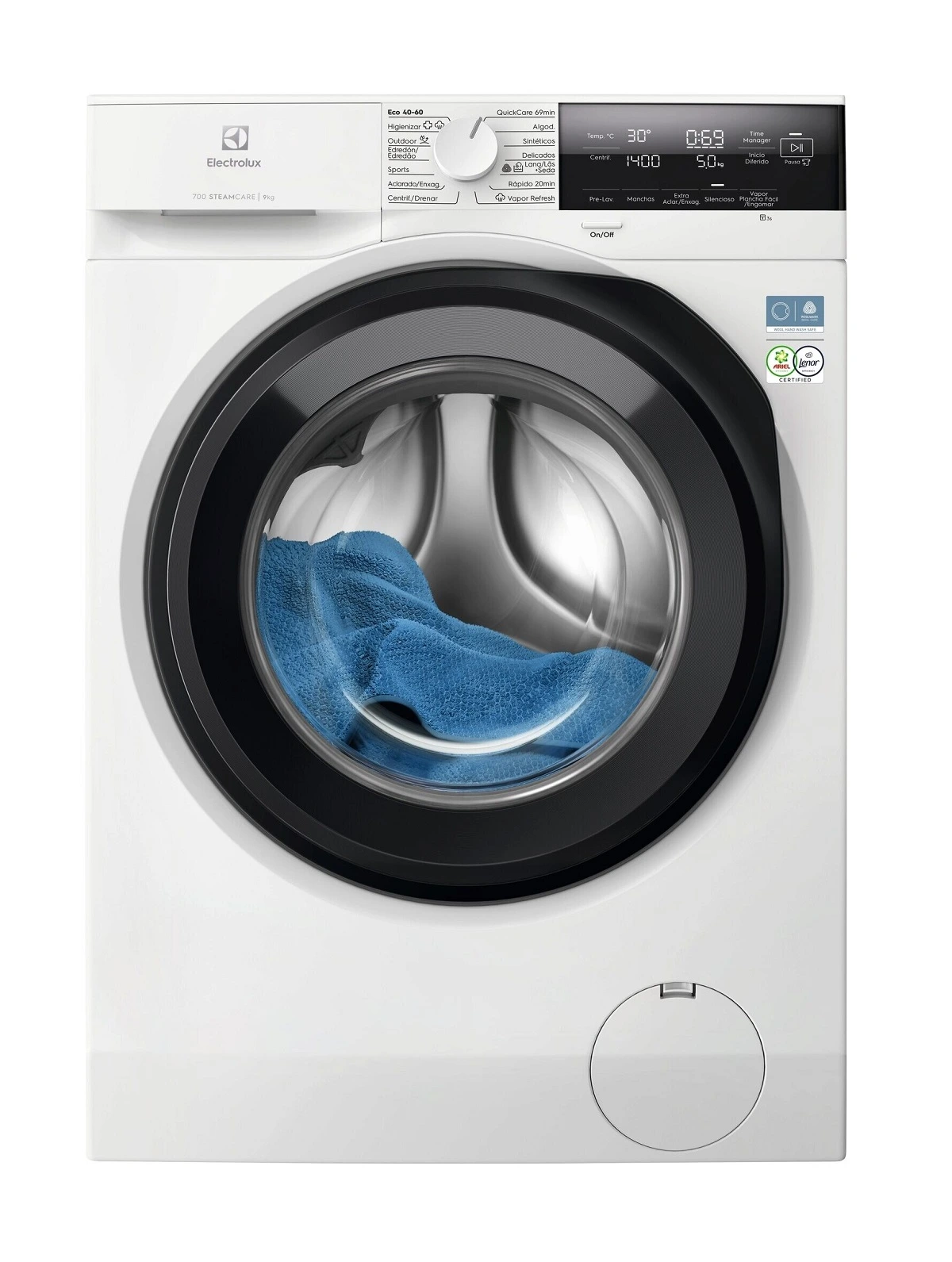 Lavadora Electrolux EFI7394N2B SteamCare, SenSiCare+ de 9 kg a 1.400 rpm, motor Inverter, Time Manager, display XL, función de Inicio diferido 1-21 horas, cajón largo, certificado Woolmark Blue, Panel Blanco y Puerta Grafito.