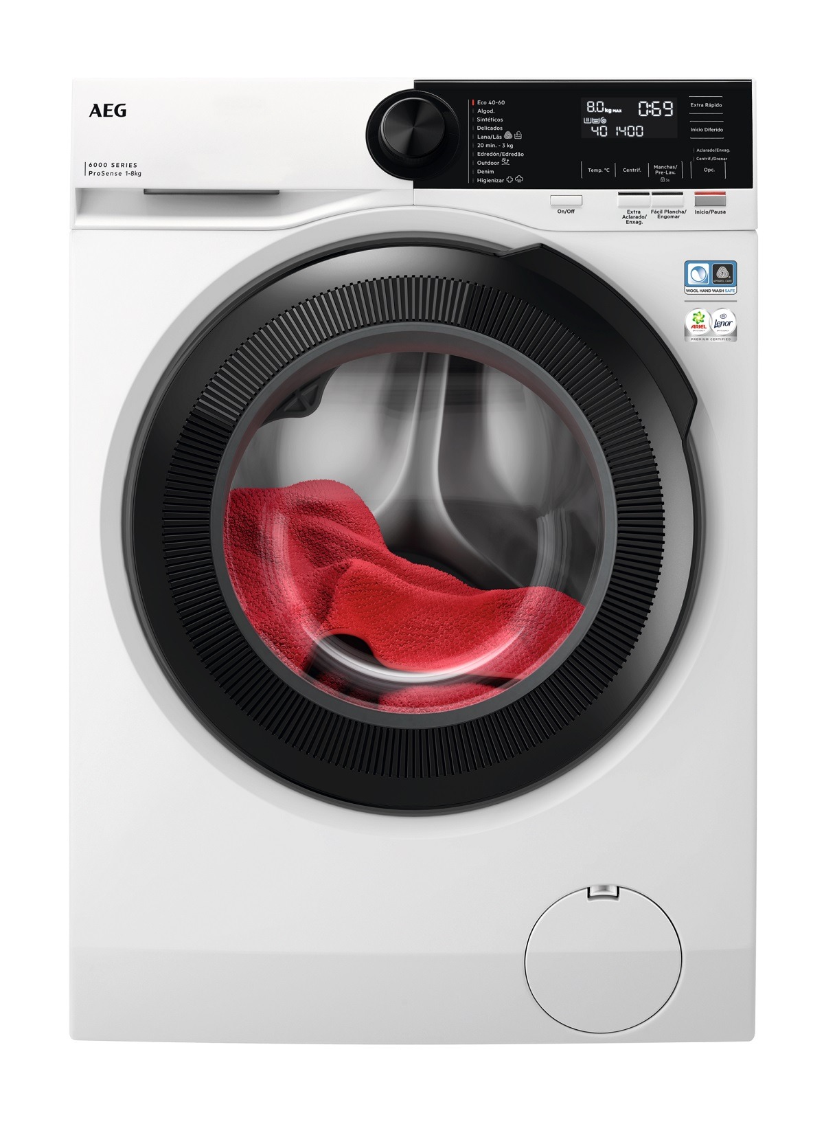 Lavadora de libre instalación AEG LFR6284N4B Serie 6000 ProSense® de 8 kg y 1.400 rpm, diplay LED Medio con sistemas ProSense®, programa Higiene con Vapor, puerta negra y panel blanco, motor Inverter, certificado Woolmark Blue.