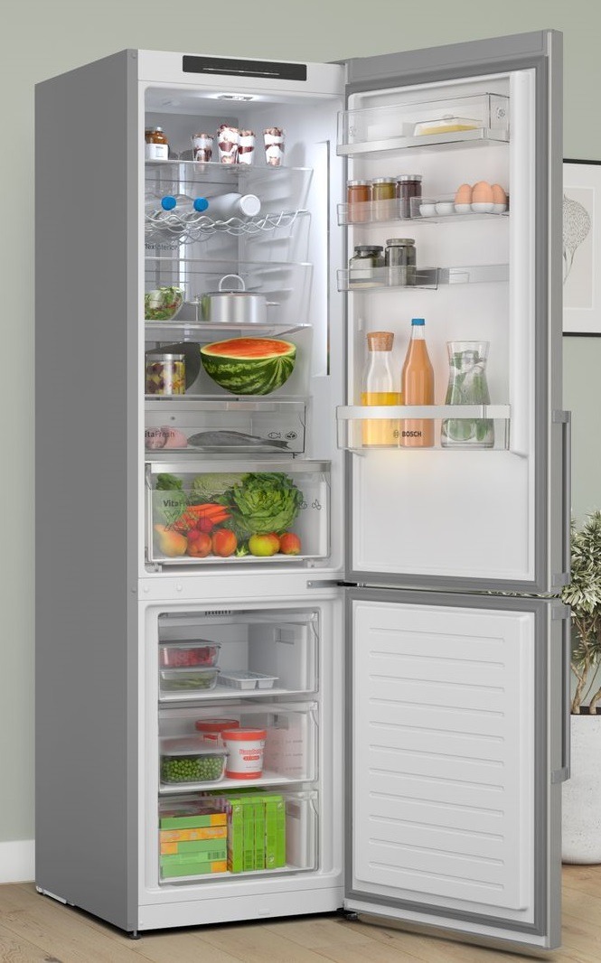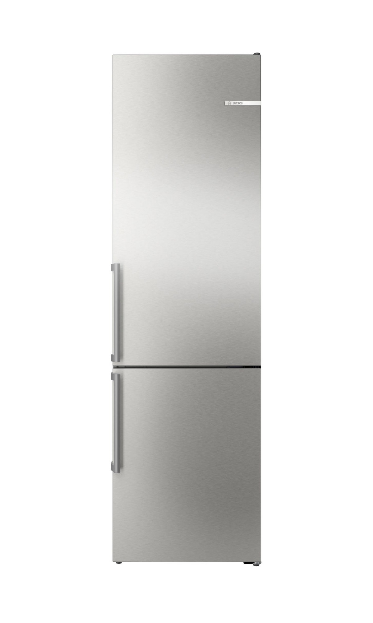 Frigorífico combi Bosch, Puertas Acero antihuellas, 203 x 60 cm. Tecnología NoFrost MultiAir Flow. Clase A, cajon 0°C. Tecnología Inverter. Posibilidad de unión de dos aparatos con el accesorio de unión correspondiente. Tirador de aluminio exterior
