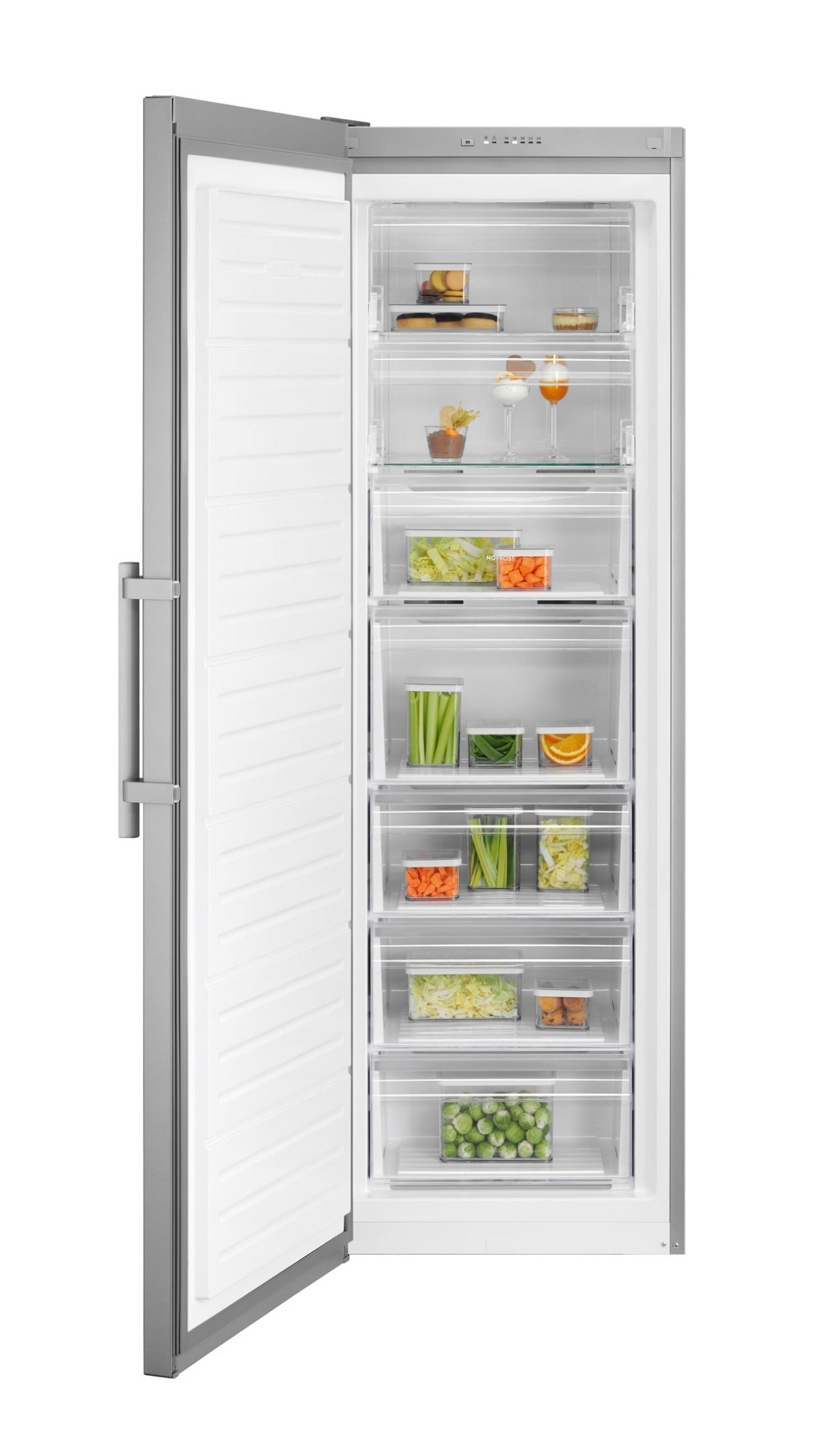 Congelador vertical de libre instalación Electrolux LUT6NE28U de Serie 600, No-Frost, 280L.,1,86 m. x 60 cm, No Frost, display digital LED en el interior, 5 cajones y 2 puerta abatibles, tirador corto, Aspecto INOX, posibilidad de instalación en conjunto con LRS3DE39U