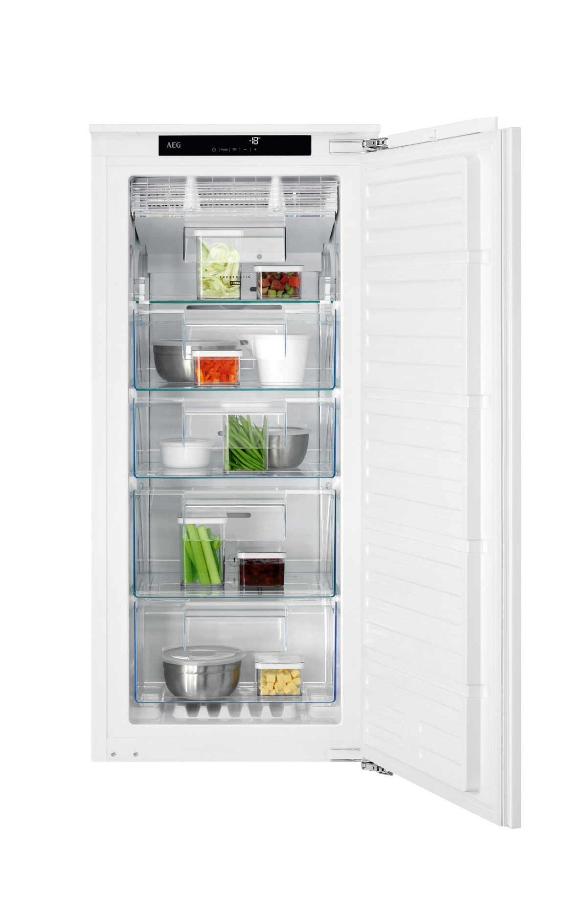 Congelador vertical integrable AEG TAB7N12EF de la Serie 7000 NoFrost 1,22 mts x 55,6cm, No Frost, Display digital, 4 cajones + 1 puertas abatibles, Puerta sobre Puerta, Compresor Inverter, Función Frostmatic.