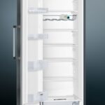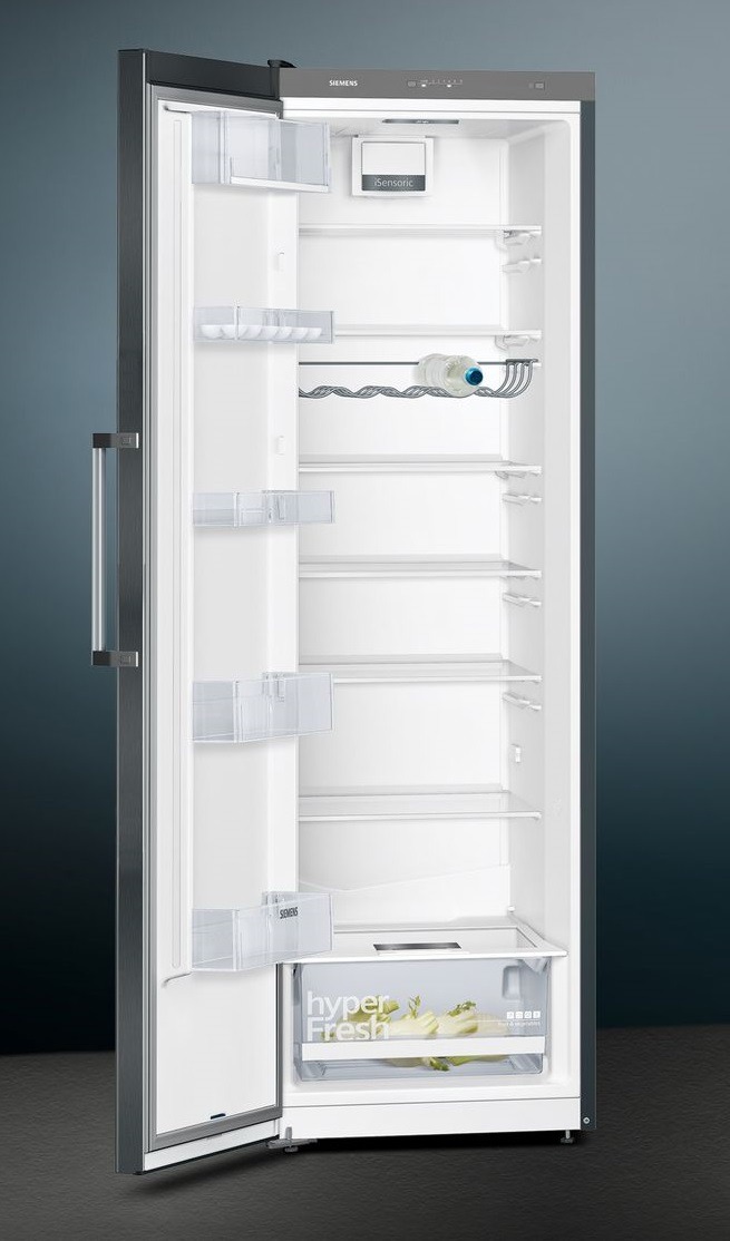 Frigorífico Siemens 1 puerta de libre instalación Puerta Black Inox antihuellas, 186 x 60 cm. Clase E. Sistema cíclico con ventilador integrado. Función “super-refrigeración” con desconexión automática.