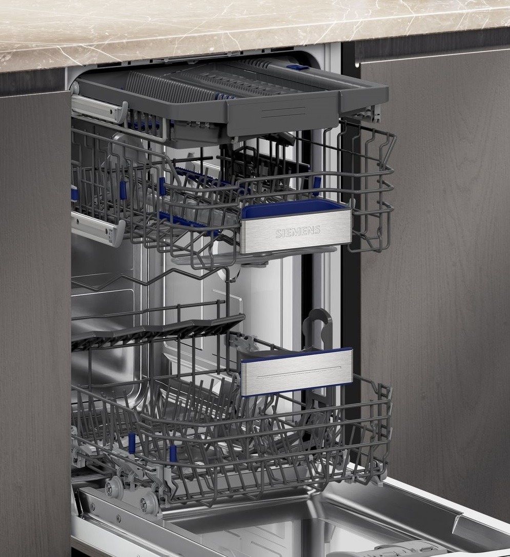 ¿Te preocupa que un lavavajillas de 45 cm no tenga suficiente capacidad? Nuestros lavavajillas de 45 cm con cestas varioFlex Pro y 3ª bandeja varioDrawer Pro permiten reconfigurar el interior para adaptarse a todo tipo de recipientes y utensilios. La bandeja para cubiertos tiene 2 juegos de varillas abatibles para colocar cucharones, pinzas y pequeños cuencos, lo que deja más espacio para la vajilla y las ollas. Gracias a las 7 filas de varillas abatibles, las 2 repisas para tazas, los 2 elementos antideslizantes y el soporte para copas, te sorprenderá la cantidad de recipientes y utensilios de todo tipo que caben en el lavavajillas.